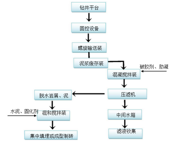 西安華揚(yáng)油氣設(shè)備有限公司此工藝主要流程為:將鉆井過(guò)程中排放的廢棄泥漿通過(guò)泥漿收集箱,用泵提升送至巖屑緩存裝置,用泵提升至破乳混凝罐,用干粉投加機(jī)定量加破乳、助凝藥?;炷河商沾呻p缸泵抽至撬裝隔膜壓濾機(jī)進(jìn)行固液分離,分離出來(lái)的泥餅由皮帶輸送機(jī)輸送出壓濾單元,濾液進(jìn)入后續(xù)凈化處理裝置。