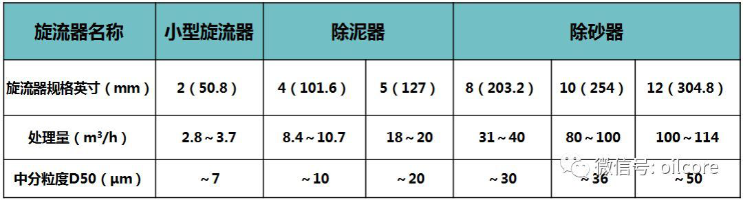 如152.4~304.8mm(6~12英寸)的旋流器稱為“除砂器”,分離點(diǎn)約為40微米,把50.8~152.4mm(2~6英寸)的旋流器叫做“除泥器”,分離點(diǎn)約為15微米。