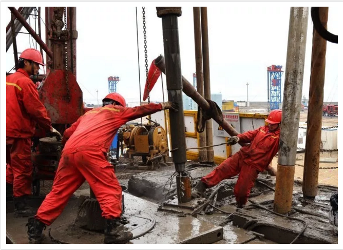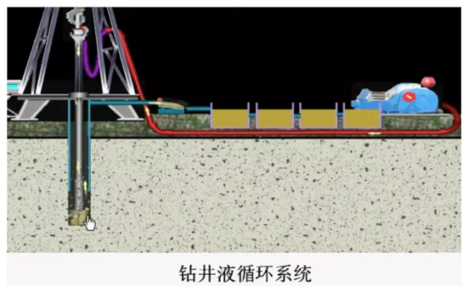 鉆井泵將泥漿從泥漿罐中吸入,經(jīng)鉆井泵加壓后的泥漿,經(jīng)過高壓管匯、立管、水龍帶,進入水龍頭,通過空心的鉆具下到井底,從鉆頭的水眼噴出,經(jīng)井眼和鉆具之間的環(huán)行空間攜帶巖屑返回地面,從井底返回的泥漿經(jīng)各級泥漿凈化設備,除去固相含量,然后重復使用。