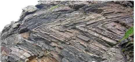 巖層在側(cè)方壓應(yīng)力作用下發(fā)生的彎曲叫褶曲。褶曲僅指巖層的單個彎曲,而巖層的連續(xù)彎曲則稱為褶皺。褶曲的基本類型有兩種:背斜和向斜。背斜是核部的巖層相對較老,兩翼的則較新的褶曲。向斜是核部的巖層相對較新,兩翼的則較老的褶曲。